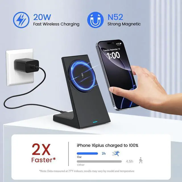 Strong Magnetic&Fast Charging: Make wireless charging a breeze with the N52 ultra-strong magnets that snap into place for precise alignment and secure attachment. The 20w Mag-Safe Charger stand has been rigorously tested hundreds of times in our labs charging for iPhone 16 Plus from 0% to 100% in just 2h - a 2x speed increase and a Significantly reduce your waiting time!??