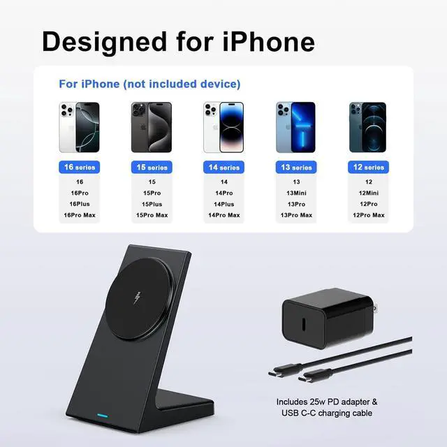Designed for iphone: Magnetic wireless charger stand is compatible withiPhone 17 17 Pro 17 Plus 17 Pro Max iPhone 16 16 Pro 16 Plus 16 Pro Max 15 15 Pro 15 Plus 15 Pro Max iPhone 14 14 Pro 14 Plus 14 Pro Max iPhone 13 13 Pro 13 Pro Max 13 Mini and iPhone 12 12 Pro 12 Pro Max 12 mini and AirPods 3 Pro 2 and Pro series.