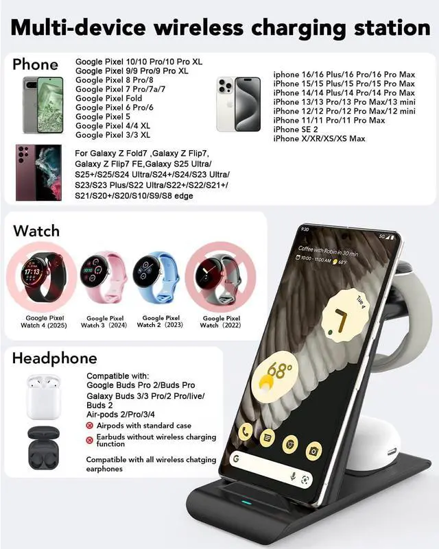 Google Pixel Watch 3/2]: The 3 in 1 pixel wireless charger stand can charge multiple devices of your Pixel phone Pixel watch 3/2 ONLY Pixel buds Pro 2/Pro/2. COMPATIBLE WITH Google Pixel Fold Google Pixel 10/10 pro/10 pro xl/9/9 pro/9 pro xl/9 pro fold/8/8 Pro/7/7a/7 Pro Pixel 6/6 Pro Pixel 5. This charger stand also compatible with fitbit versa 4/3/sense/sense 2[Charging Station for Multiple Devices] The Pixel 10 wireless charger comes with a QC 3.0 adapter and also can charge with the following