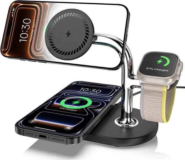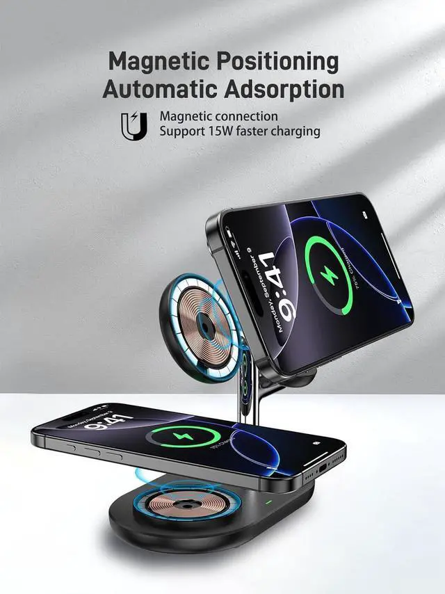Convenient Dual Magnetic Charger- This 3 in 1 Magnetic Wireless Charger is a dual wireless charger it can charge your two iPhone watch at the same time. Ideal for couples or households with multiple phones of. Charging Station for Multiple Devices - This dual mag-safe charger can charge your two iPhone watch at the same time. The base part can also charge the AirPods. It is a wireless phone charging station an watch charger iPhone stand holder and also an airpods charger station. All-in-one design gives you a clean and tidy desktop. Wide Compatibility- While this 3 in 1 charging station for charge iPhone 17/16/15/14/13/12 Series and Watch Ultra/Ultra 2/SE iWatch 10/9/8/7/6/5/4/3/2; Charge for Airpods or other devices on the charging pad below simultaneously.