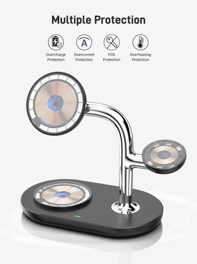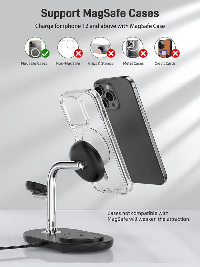 Props up your phone securely precise align charge in any orientation portrait or landscape. 20W Fast Adapter included. Intelligent Charging Multi-protection - This for iphone wireless charger has the latest built-in smart chip with over-current protection over-voltage protection over-temperature protection short-circuit protection and foreign object detection. It can protect your battery equipment from overcharge damage and provide comprehensive protection for you and your devices. What You Will Get- 1x 3 in 1 wireless magnetic charger for iphone +1x Charging Adapter + 1x USB Charging cable + 1x User Manual. It is the best holiday gift for personal use or to father family and friends.