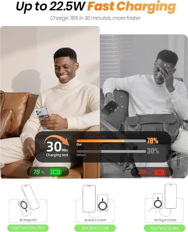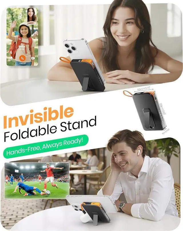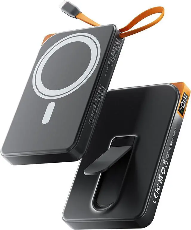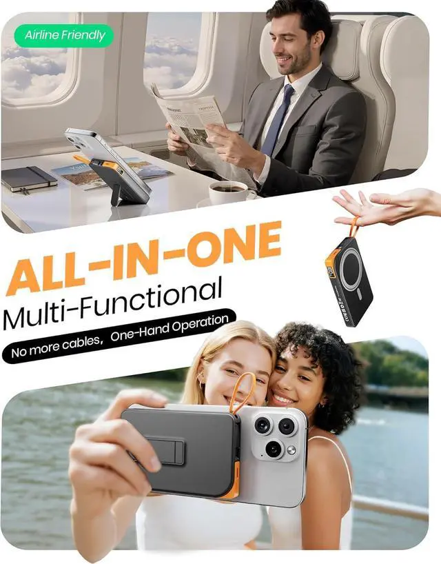 ? Magnetic Power Bank with StandThis battery pack features a foldable stand for hands-free viewing. Perfect for watching videos during meals video calls while working or following recipesall while charging with MagSafe. Soft silicone surface protects against scratches with no camera blockage.?? 10000mAh PowerBankThis power bank for iphone Built-in 10000mAh battery with LED display & 22.5W PD fast charging. Charges iPhone 15 Pro twice or Galaxy S24 ~2x. Compatible with iPhone 12-17 S/A/Z Pixel.?? 3-in-1 Wireless Portable ChargerFeatures built-in USB-C cable 15W MagSafe and Type-C port. Charges 3 devices simultaneously.