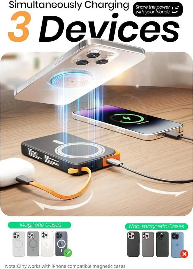 Bidirectional Type-C for in/out power. Ideal for travel outdoor dorm & emergency use.??? Smart Safety Power BankThis power bank fast charging has a built-in smart chip with full protection (overcharge/overcurrent/overvoltage/overheat/short-circuit). Multiple cooling cores for temperature control. Safe and reliable charging.?? What Youll Get1×10000mAh portable charger iphone 2×USB-C cables (1 built-in) manual. Charges MagSafe iPhones 12-17 (bare or with MagSafe case). Not for Android.