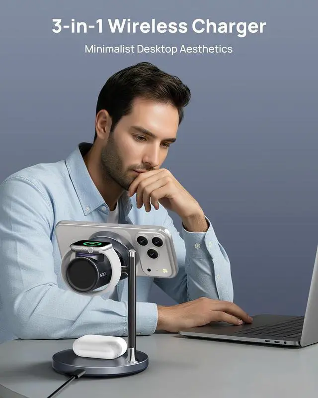 Charging Station: This 25W wireless charger stand powers your phone watch and earbuds at once to declutter your desk or nightstand. Its 36° adjustable angle allows for optimal viewing while ensuring all 3 devices charge without interference. Qi 2.2