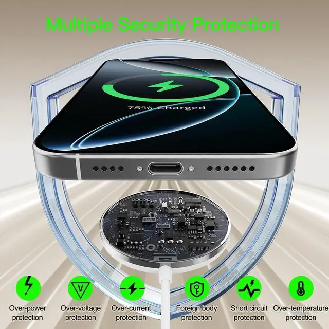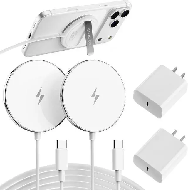 Charger Fast Charging]: Put your phone on the magnetic charger pad use the 20W charger block charging your iPhone 3X faster than the other iPhone charger supports 5W 7.5W 15W and Max 20W wireless charging Charge your iPhone 16 from 0 to 100% in 2- 2.5 hours. you can quickly power up your devices without any hassle efficient charging brings you a better experience[Super Travel Accessories Charger Stand for Mag-safe] It not only retains the advantages of the magsafe stand but also achieves the ultimate in lightness thinness and portability. Its size is similar to an AirPods 3 which can be easily placed in your pocket anytime and anywhere. It can not only conveniently charge your iPhone AirPods on the go as travel charger for multiple devices but also acts as a phone holder anytime making it the perfect assistant for TV shows and video calls on the goCustomized for Phone17/16/15/14/13/12 SeriesOur 2 pack iPhone wireless charger uses the latest system easy to connect and more convenient for wireless charging. Especially suitable for iPhone Air/ iPhone17/iPhone 17 Pro/iPhone 17 Pro Max/ iPhone 16/15/14 16/15/14 Pro 16/15/14 Pro Max 16/15/14 Plus; iPhone 13 13 Pro 13 Pro Max 13 Mini; iPhone 12 12 Pro 12 Pro Max 12 Mini and 432 iPhone 8 above models with Mag-Safe case also supports magnetic chargingStrong magnetic and intelligent protectionThe magnetic charging station features radiation-free FCC-certified magnetic isolation sheets.