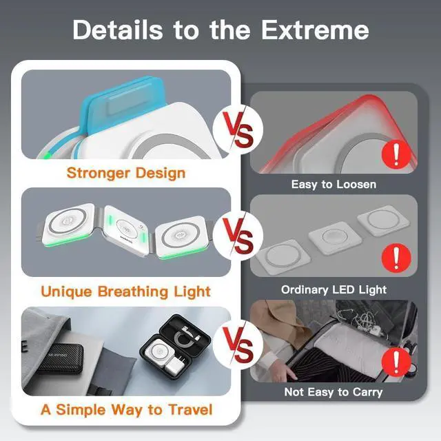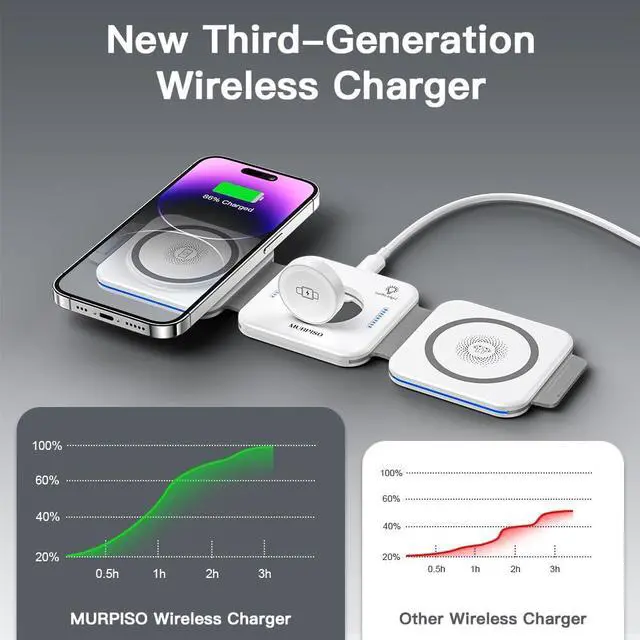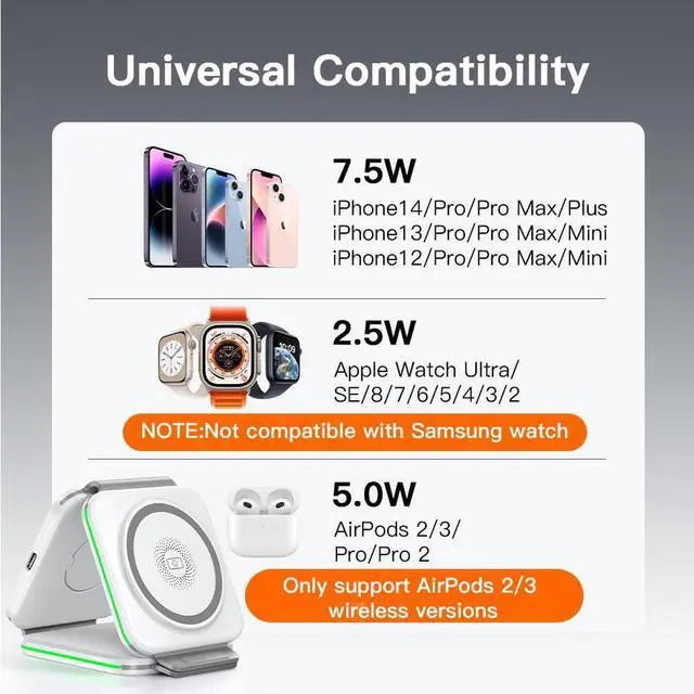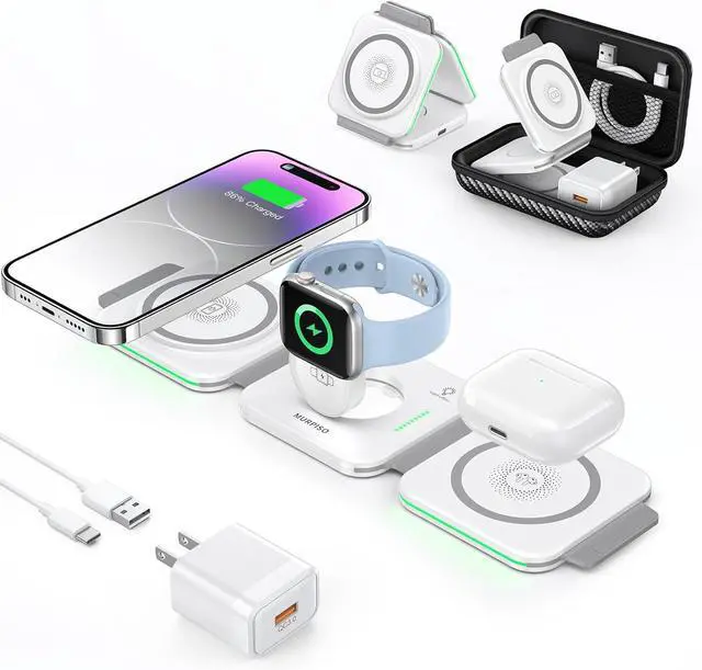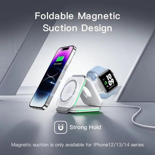 3 IN 1 Magnetic Wireless ChargerNew third-generation wireless charger features thesmall earstrong magnetic bracket design which can be folded into a sturdy wireless charger stand to support three charging modes. This 3 in 1 wireless charging station for has upgraded its built-in magnet and the magnetic function of watch charger achieving power in a snap. If you want to use the magnetic feature of this wireless charger make sure the phone model is for iPhone 12/13/14/15/16/16e/17 series. More Suitable for TravelWireless charging station for device can be magically stored quickly! Our magnetic wireless charger comes with a storage case and adapter so you can easily fold your wireless charging station into the storage case to avoid bumping and scratching your wireless charger while traveling.