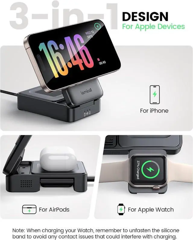 Devices: Charge your iPhone Watch and AirPods simultaneously with just one cable. This Lamicall 3 in 1 charging station is a one-stop solution featuring a powerful mag-safe charger for iPhone 17 16 15 14 13 & 12 Series a dedicated spot for your Watch (Series 11 Ultra 3 and older) and a wireless charging area for /3rd/2nd Gen with a wireless charging case.