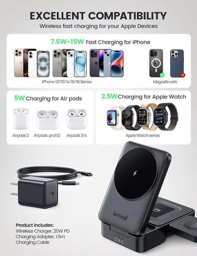 What You Get: Lamicall 3 in 1 Foldable Wireless Charging Station (Not a Power Bank) 20W Charging Plug 59in USB-C charging cable instruction manual.???