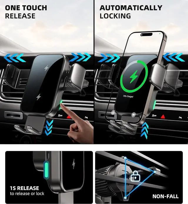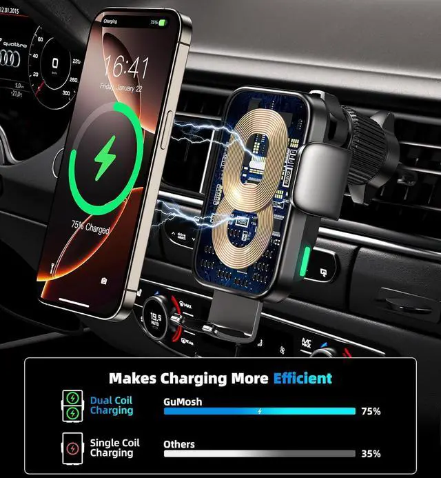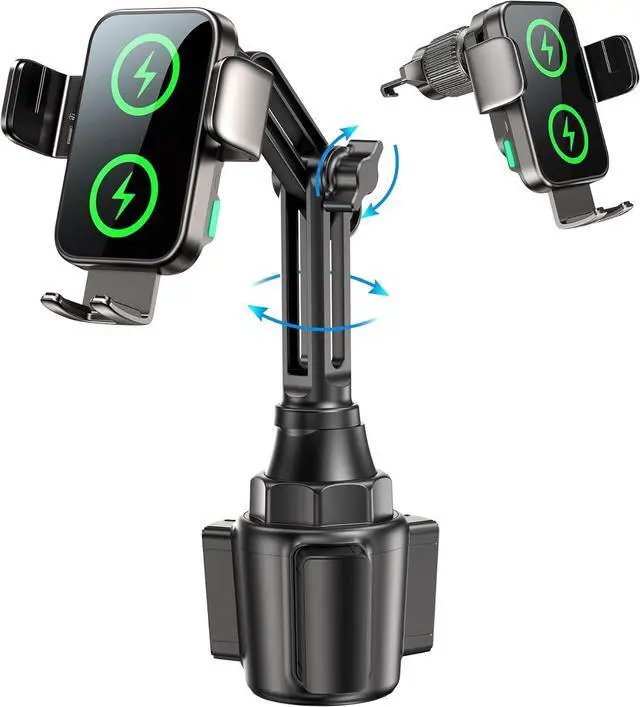 Dual-Coil 15W Wireless Fast Car Phone Holder Charger??? Wireless Charging Friendly TipKeep your phone case under 5mm thick for smooth wireless charging! Thicker cases (like rugged or wallet-style ones) might block the connection or slow down charging. GuMosh 2 in 1 car phone holder is equipped with QC 3.0 and dual-coil technology that supports rapid charging up to 15W. It can charge through cases up to 5mm thick and is compatible with a variety of phone models including the Flip series Galaxy S24/S23/S22/S21/S20 series LG V60/50/40/35/30+ and iPhone 17/17Pro/17Pro Max/17 Air/16 15/14/13. Adjustable Viewing AngleThe cup phone holder for car comes with a sturdy telescopic long arm that extends up to 11.5 inches.