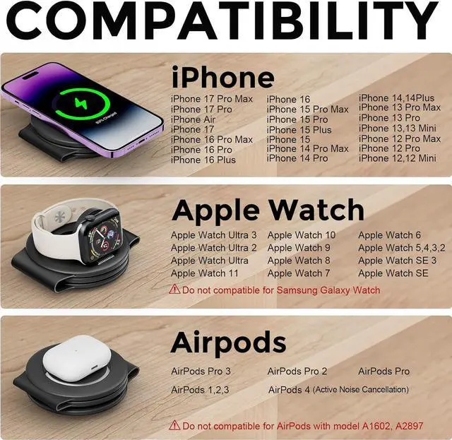 Charger 18 W: This charging pad has a higher height design to prevent damage to your camera and ensures stable charging without any interruptions caused by gaps between the phone and charger; You can trust the safety and reliability of this wireless charger; It makes for a great present choice for both men and women3-in-1 Charger compatible with Watch Ultra 3/2/1 Series 11/10/9/8/7/6/5/4/3/2/SE/SE3; AirPods 4/3/2/1 3/2/1; iPhone Air iPhone 17/17 Pro/17 Pro Max 16/16 Plus/16 Pro/16 Pro Max 15/15 Plus/15 Pro/15 Pro Max 14/14 Plus/14 Pro/14 Pro Max 13/13 Mini/13 Pro/13 Pro Max 12/12 Mini/12 Pro/12 Pro Max
