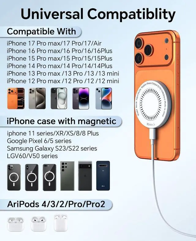 Mins: Delivers 3x faster charging vs. standard 5W chargers50% battery in 30 minutes for iPhone 16/17 series. Includes 2 wireless pads 2 adapters and 2 USB-C cables (6FT) for flexible setups at your desk bedside or carStrong