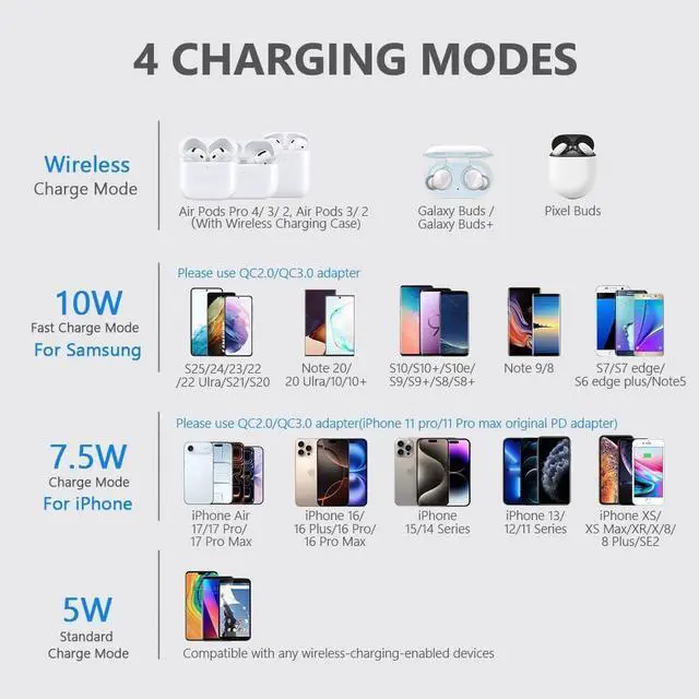USB C CHARGER]: Including 20W USB C Charger charge your phone more effectively and provide you a better charging experience. No longer to consider what kind of wall charger is the best for you to use.? [3 CHARGING MODES AVAILABLE FOR DIFFERENT PHONES]: 7.5W charging mode is compatible with iPhone 17/17 Pro/17 Pro Max/Air/16/15/14/13/13 Pro/13 Mini/13 Pro Max/12/12 Pro/12 Mini/12 Pro Max/SE 2022/11/11 Pro/11 Pro Max/XS MAX/XS/XR/X/8/8 plus with latest iOS System; 10W charging mode is compatible with S25/S24/S23/S22/S22 Ultra/S21/S20/Note 10/10 Plus/S10/S10 Plus/S10E/Note9/S9/S8 and so on; 5W charging mode works on any wireless-charging-enabled devices like Google Pixel 3/3XL/4XL and other wireless-charging-enabled phones.? [UNIQUE