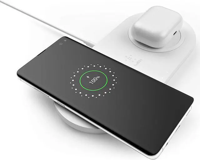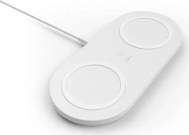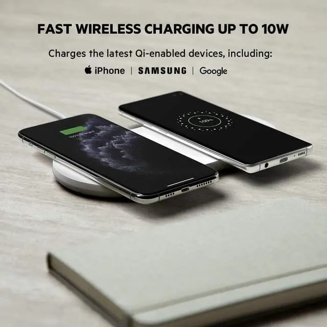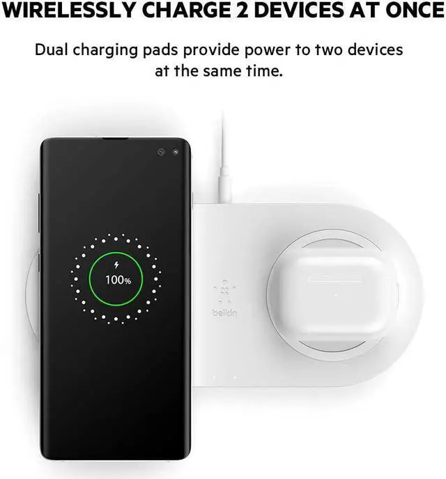 DUAL FAST CHARGE: The Belkin Quick Charge Dual Wireless Charging Pad can quickly charge up to two of your Qi-enabled devices at once with 10W of power each (Quick Charge Power Supply Included) DUAL PAD DESIGN: The convenient dual-pad design allows you to wirelessly charge multiple Qi-enabled devices like a smartphone and earbuds at onceWORRY