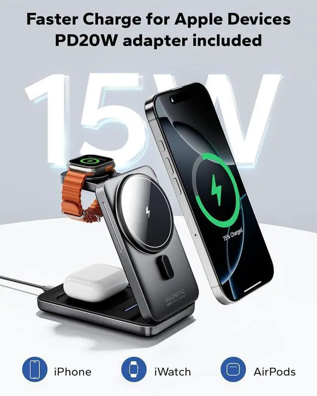 3 in 1 Magnetic Charging StationDesigned specifically for devices the mag-safe charging station is capable of charging an iPhone Watch and AirPods simultaneously. Say goodbye to the hassle of finding enough outlets and untangling messy cables keeping your space tidyFast Charging and Efficient Heat DissipationEquipped with a high-efficiency chip the wireless charging station can fully charge an iPhone 15 Pro in just 2 hours and 23 minutes. The charger's body features multiple ventilation holes for efficient heat dissipation effectively alleviating overheating during wireless chargingFoldable & Travel-friendly DesignThe 3in1 charging station for magsafe has a compact and design with exquisite craftsmanship.