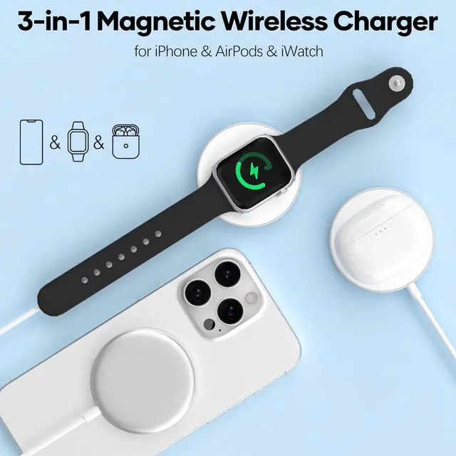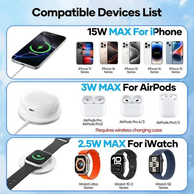 3 in 1 Charger Station Wireless charging pad contains a magnetic suction which can automatically and accurately charge the 12 and above series. The magnetic suction is suitable for iPhone 17 / 17 Air / 17 Pro / 17 Pro Max iPhone 16/16 Plus/16Pro/16 Pro max15/15 Plus/15Pro/15 Pro max/14/14 Pro/14 Plus/14 Pro Max/13/13 Pro/13 Pro Max/12/12 Pro/12 Pro Max. It is also compatible with Watch Ultra 8 7 6 5 4 3 2 & AirPods 3/2/Pro with wireless charging case. Say goodbye to clutter and multiple chargers just bring this one! 15W Fast Wireless Charger Wireless charger has a 15W of output power charging your phone from 0 to 100% takes only 2.5 hours (recommended to use a 20W or higher adapter for max 15W charging 5V/2A adapter is unsuitable and it will reduce charging efficiency) supports 3W max for AirPods and 2.5W max for iWatch.