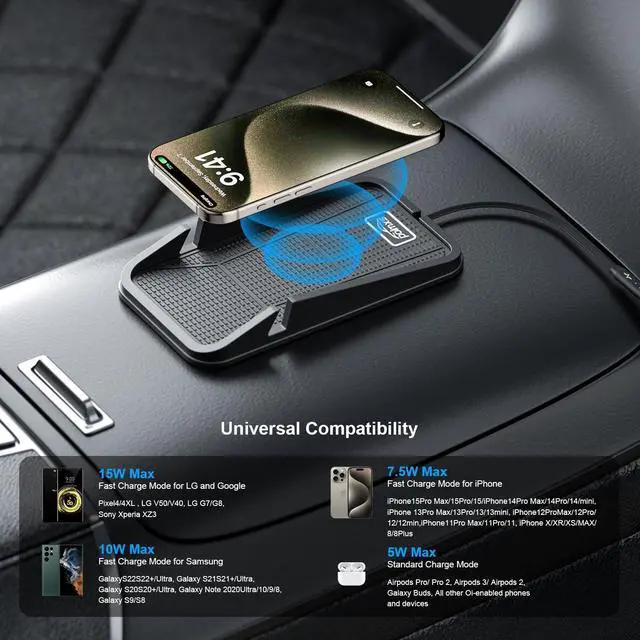 15W charging mode compatible with S20/ S21/ S22/ LG V50/ V40/ V35/ V30/ G8/ G7 10W charging mode compatible with Galaxy S10/S10+/S9/S9+/S8/Note 20/Note 20 Ultra/Note 10/Note 10+/Note 9 7.5W charging mode is compatible with iPhone 14/14 Plus/14 Pro/14 Pro Max/13/13 Pro/13 Mini/13 Pro Max/12/SE 2020/11/XS/XR/X/8 with latest iOS System 5Wcharging mode works on Any wireless-charging-enabled (not fast charging in this mode).?? New design Wireless charger pad to avoid over heat - POLMXS C17 wireless car charger has been design to separate the charging coil from the circuit board which might get some heating when the pad coil is supply wireless charging.