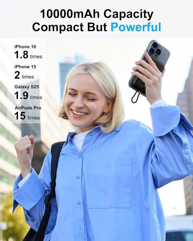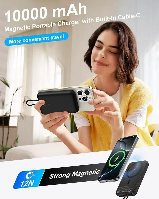 (Note: Slight heating due to efficiency losses in the conversion circuit is normal. )Strong Magnetic Portable Charger & Built-in Type-C Cable: This Magnetic battery pack has built-in USB-C charging cable perfectly compatible with iPhone or Type-C devices no need to carry extra cables; This portable phone charger with the newest magnetic technology can directly hold the back of your iPhone 16/15/14/13/12 Series so you can single-handedly take selfies make calls and more. You can charge your phone anytime and anywhere perfect for travel vacation and camping.