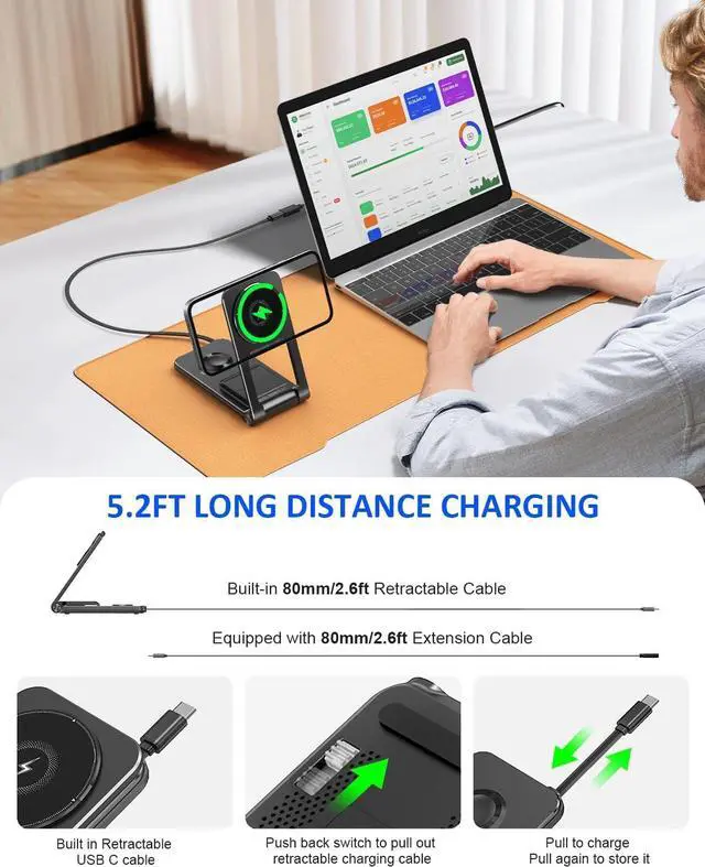 Equipped with a high performance chip featuring Over-temperature Over-current Over-voltage Short-circuit protection and Foreign Object Detection. It safeguards your device All Around Prolonging Battery life and Offering an Excellent Charging Experience. [Say Goodbye To Cable Hassles] This 3 In 1 Charger Stand comes with a user-friendly cable design. It has a 80cm( 2.6 ft) Built-In Retractable Cable Plus a 80cm( 2.6 ft) Extension Cable Giving you a full 1.6 m( 5.2 ft) of length. No more lugging around Extra Cables! One press of the Back Button and the cable glides out effortlessly. When you're done a simple tug retracts it tidily.