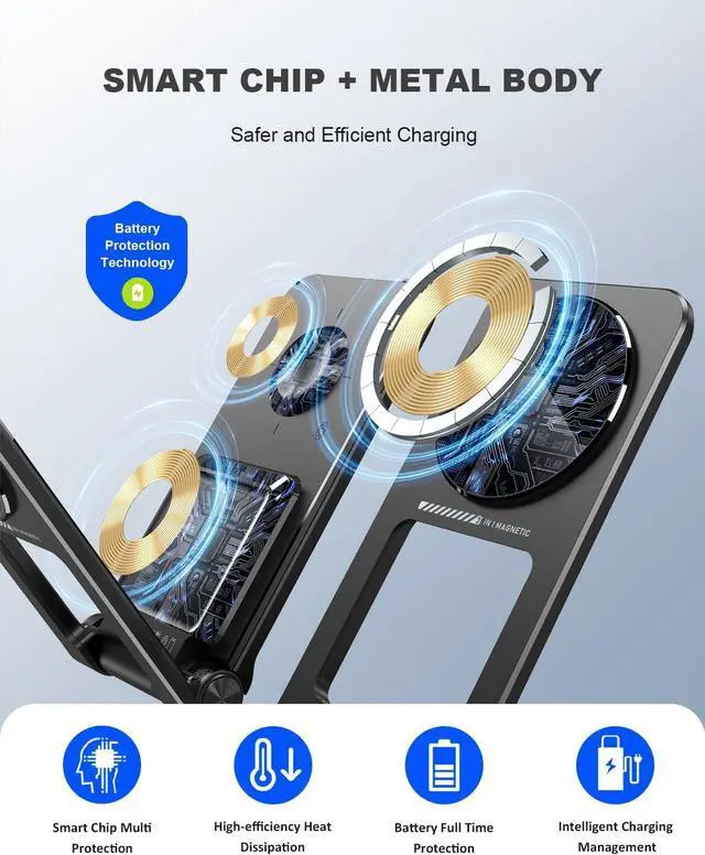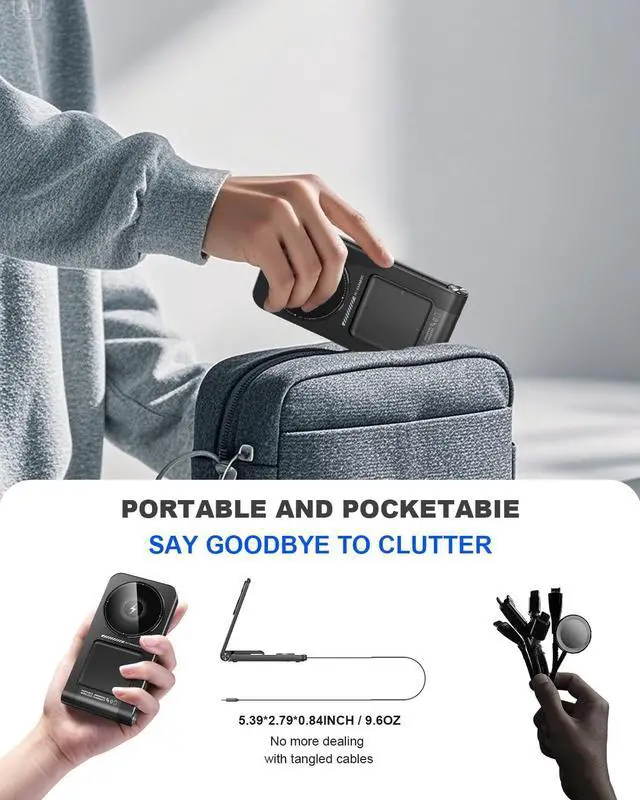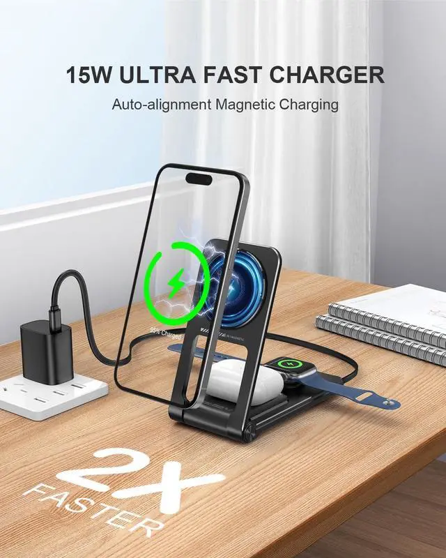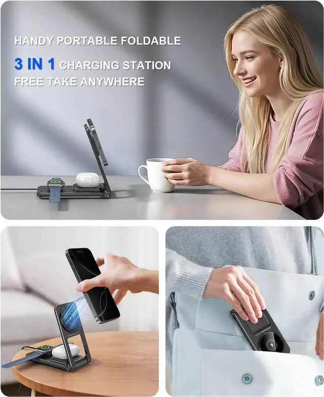 Kiss those tangled messes Goodbye! Whether you're at your desk or on the go This Charger Stand is your perfect companion. [Portable and Durable] Featuring a Foldable Design and a Retractable Cord this wireless charger is highly portable and can be easily slipped into a backpack or handbag. Its extremely sturdy Zinc - alloy body and the metal damping hinge ensure long - lasting Durability. The super-strong magnetic force holds your phone firmly in place all of which makes your charging experience more convenient efficient and safer. [What You Get] 3 in 1 Wireless Charging Station *1 Extension Charging Cable *1 20W Adapter *1 User Guide *1.