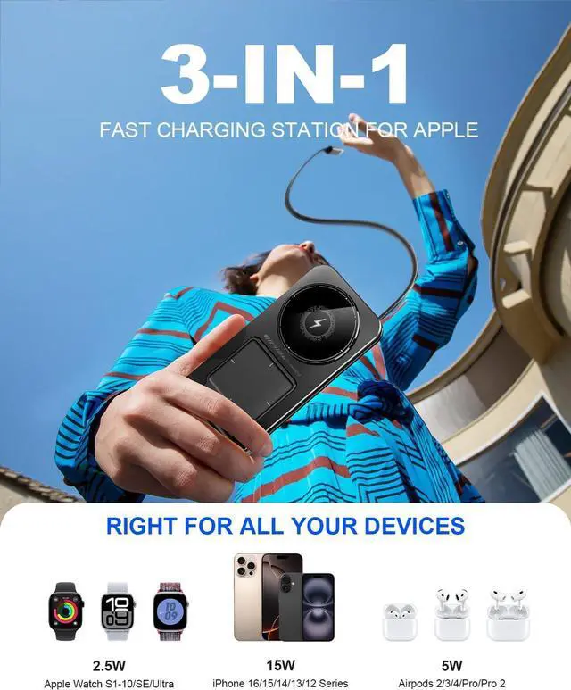 [Wireless Charger For Devices] This 3 In 1 Wireless Charging Station is compatible with iPhone 16 15 14 13 12 Series all Watch Series and AirPods 4/3/2/Pro (With Wireless Charging Case). Delivering Max 15W for Iphone 5W for Airpods and 2.5W for iwatch. A Must-have Magnetic Charger Stand for Your Home Office Travel (20W Adapter included) [Faster and Safer] Tired of slow interrupted charging due to Overheating? Worried about shortened Battery life? Our Charging Station is the Fix! With a body made of fast-heat-conducting Zinc Alloy and thermal silicone is additionally incorporated in the watch charging area it boasts an excellent Heat-dissipation ensuring fast charging without Slowdowns or Cuts.