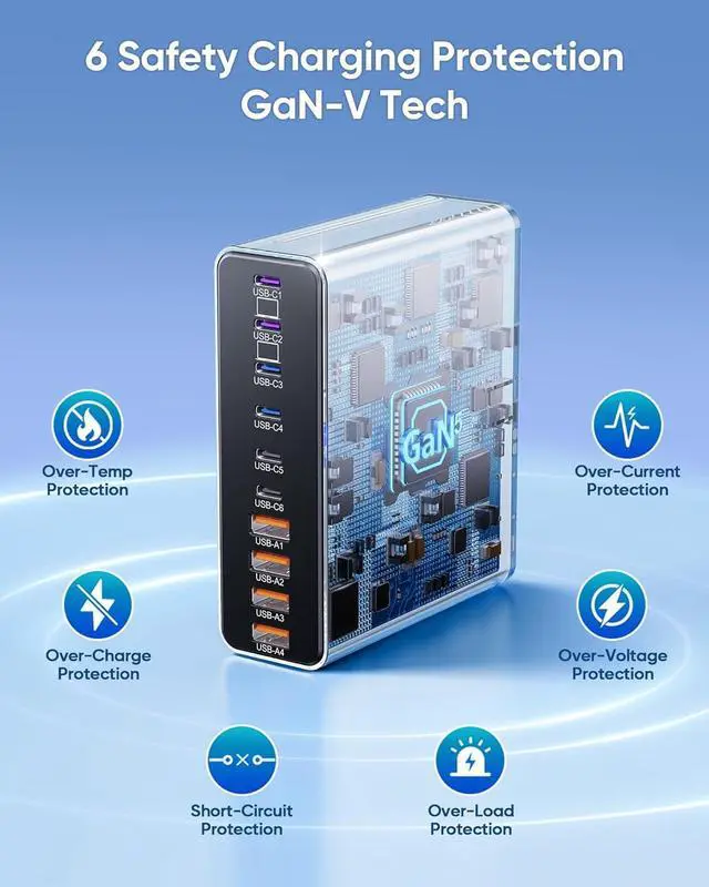 6 Layers of Safety Protection Our Charging Station uses advanced GaN 5 chip tech, with built-in protection mechanisms to safeguard your devices. It includes 6 layers of safety features: overheating protection, overvoltage protection, overcurrent protection, overload protection, overcharge protection, and short-circuit protection. Roruite adopts the latest exclusive 2025 safety tech, which provides 24/7 temperature monitoring to ensure the safety of you and your connected devices.