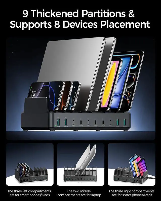Dual 100W PD Fast Charging Station: Experience blazing-fast charging with dual 100W power delivery ports, ideal for MacBooks, laptops, and high-power devices. The remaining 8 ports deliver efficient charging for phones, iPads, and wearables. This multi charging station cuts down wait times, ensuring youre always powered up. Perfect for multitaskers and busy professionals.