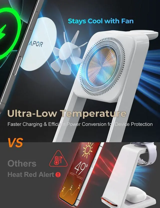 High Quality: Built-in cooling fan effectively dissipates heat during charging, protecting your device' s battery life and enhancing the charging speed, especially for wireless charger iPhone users. Stay cool, stay efficient.