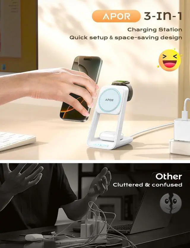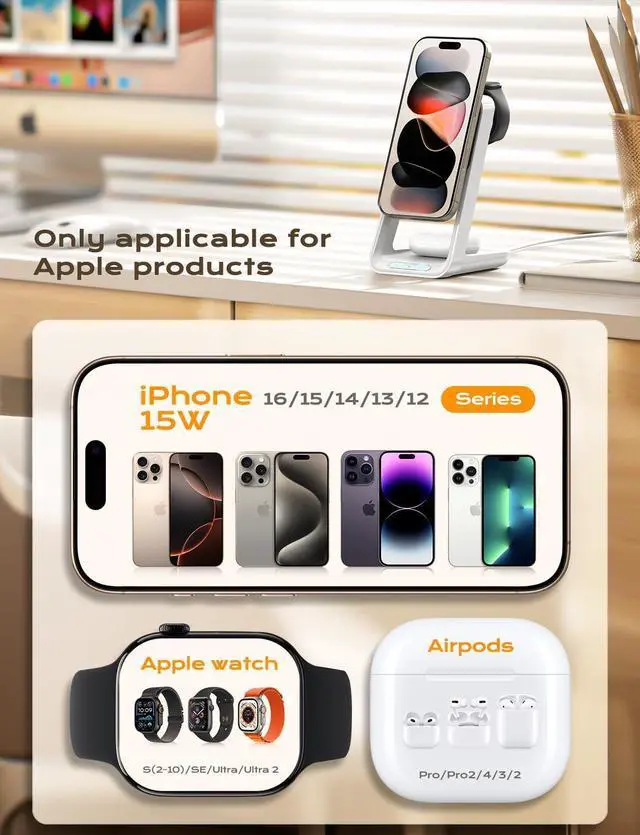 Great Wireless Charging Station Power your iPhone, Apple Watch, and AirPods all at once in one sleek charging hub. Designed for Apple users, this compact station keeps your desk, nightstand, or travel setup organized and clutter-free, replacing messy cables with one simple solution. Compatible with iPhone 16/15/14/13/12 series, Apple Watch Ultra 2/10/9, and AirPods Pro/3/4.