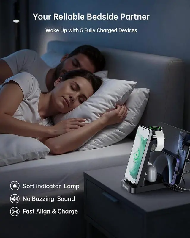 5 in 1 Wireless Charger for SamsungBERXZWE 5-in-1 wireless charging station is equipped with a USB C port and USB A port, which can simultaneously charge Samsung phones, Galaxy Watch, Galaxy Tab, and earphones, perfectly solving the problem of charging multiple devices. The portable charging station Makes your home nightstand, office desk, and meeting room more space-saving and tidy. It is an essential accessory for home, office, travel, and gifts.