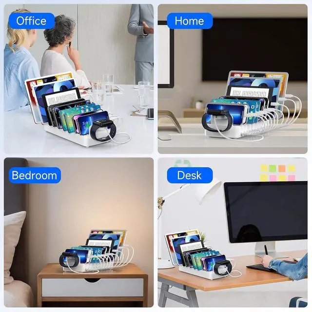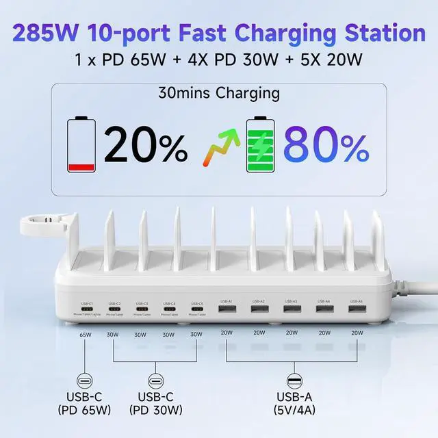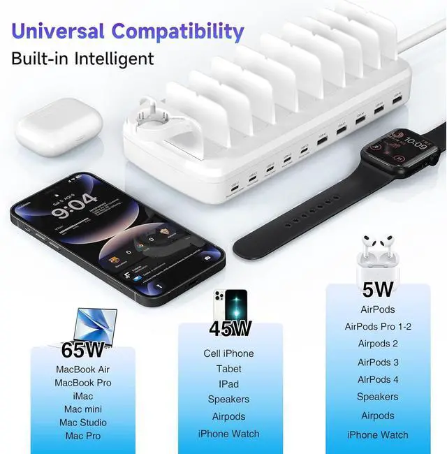 Powerful PD USB-C Fast Charging PortsOur multi-device charging station is equipped with 1 65W and 4 30W PD USB-C and 5 USB-A fast charging ports, which provide lightning-fast charging speeds and can boost your phone' s power from 20% to 80% in 30 minutes, giving you a more efficient charging experience. It also includes an Apple watch charger holder (watch charging cable is not included).