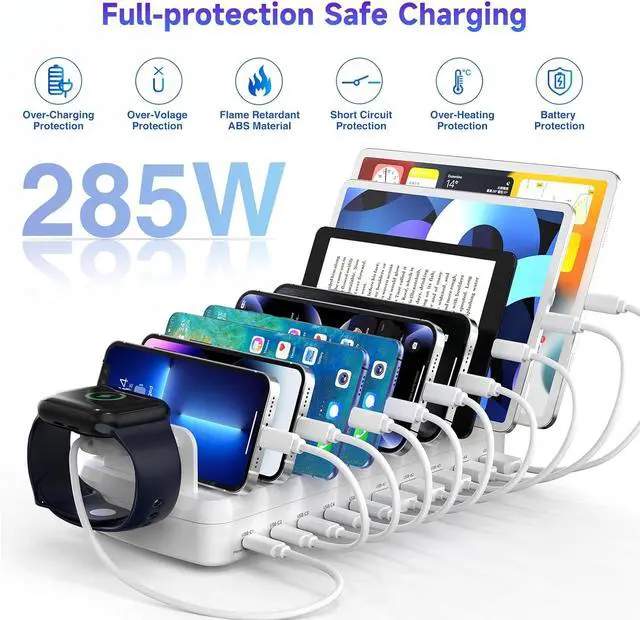 Smart Charging: Our 285W 10 Ports Fast Charging Station not only ensures fast charging, but also puts charging safety first. Our charging station has built-in advanced smart chips that can automatically detect devices and provide accurate charging current according to different devices to avoid overcharging and ensure the charging safety of your devices.