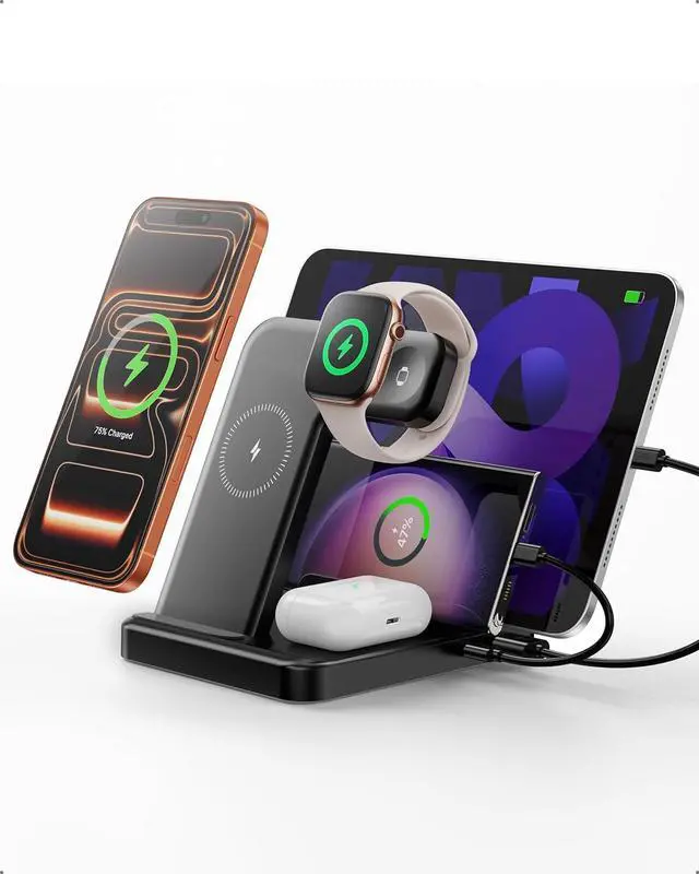 --: Experience seamless charging for all your essential devices with our 5-in-1 wireless charger. Designed for iPhone 17/17 Pro/17 Pro Max to iPhone 8 series, Apple Watch Ultra (1/2/3)/11/10/9/8/7/SE(1/2/3)/6/5/4/3/2, AirPods 4 with Active Noise Cancellation/3/2/1/Pro/Pro 2, iPad series, and Type-C devices, this station powers all your gadgets in one place. Eliminate tangled cables and enjoy effortless wireless charging in a sleek, organized setup.: //.