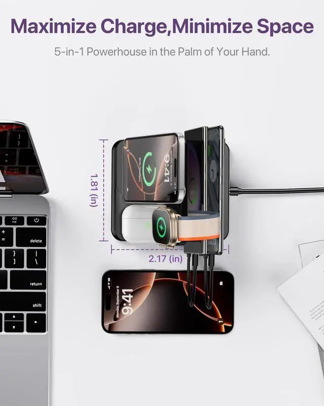 : Maximize your workspace with this 5-in-1 charging station. Designed to organize and charge your Apple devices, it features a built-in partition to keep your desk or nightstand tidy. The extra USB and Type-C ports allow you to charge additional wired devices alongside wireless charging. A perfect solution for home, office, or travel, so you can wake up to fully charged devices, all neatly arranged in one compact station.