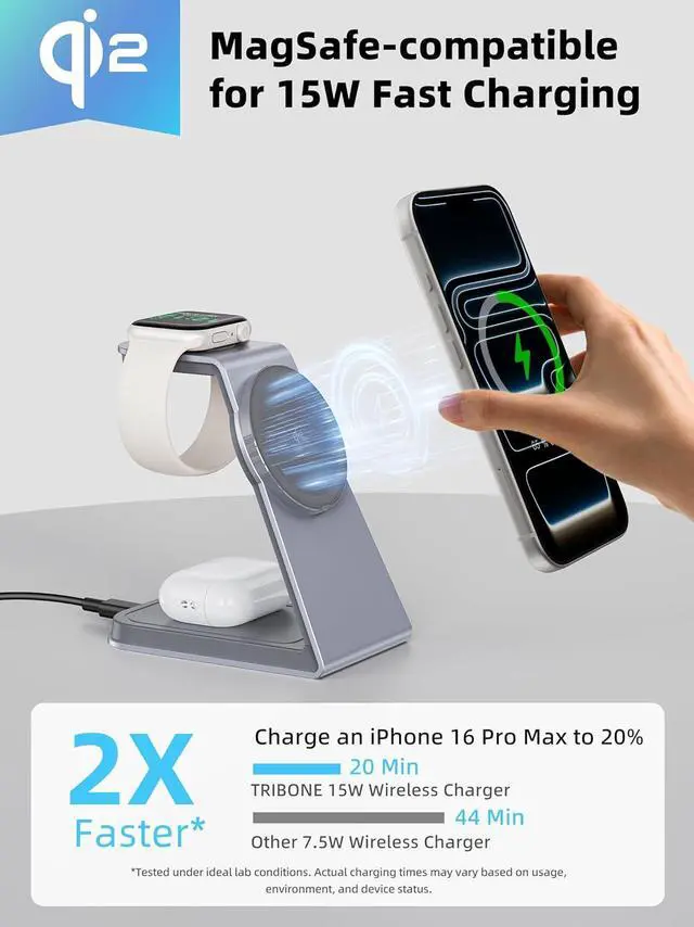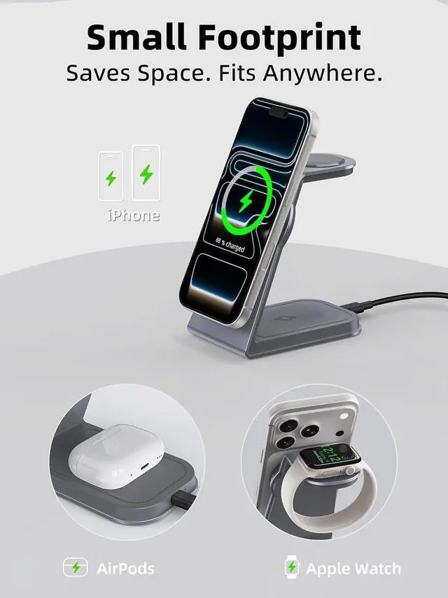 3-in-1 MagSafe Charging StationDesigned for Apple users, this 15W MagSafe wireless charging station powers your iPhone, Apple Watch, and AirPods simultaneously. Supports iPhone 17/16/15/14/13/12 series, Apple Watch Ultra/SE/11/10/9/8/7/6/5/4/3/2, and AirPods 2/3/4/Pro (with wireless charging case). A 20W fast charging adapter is included for maximum performance.