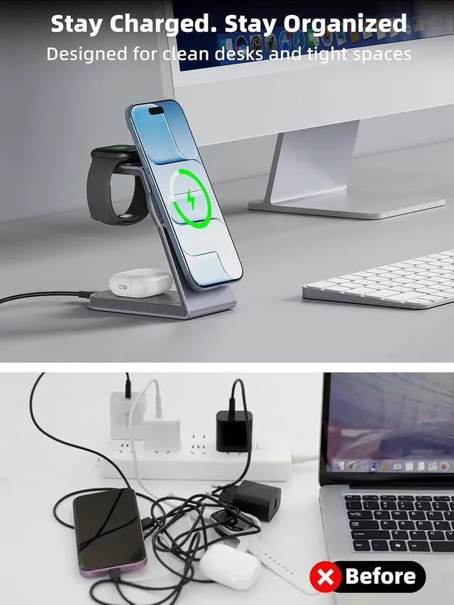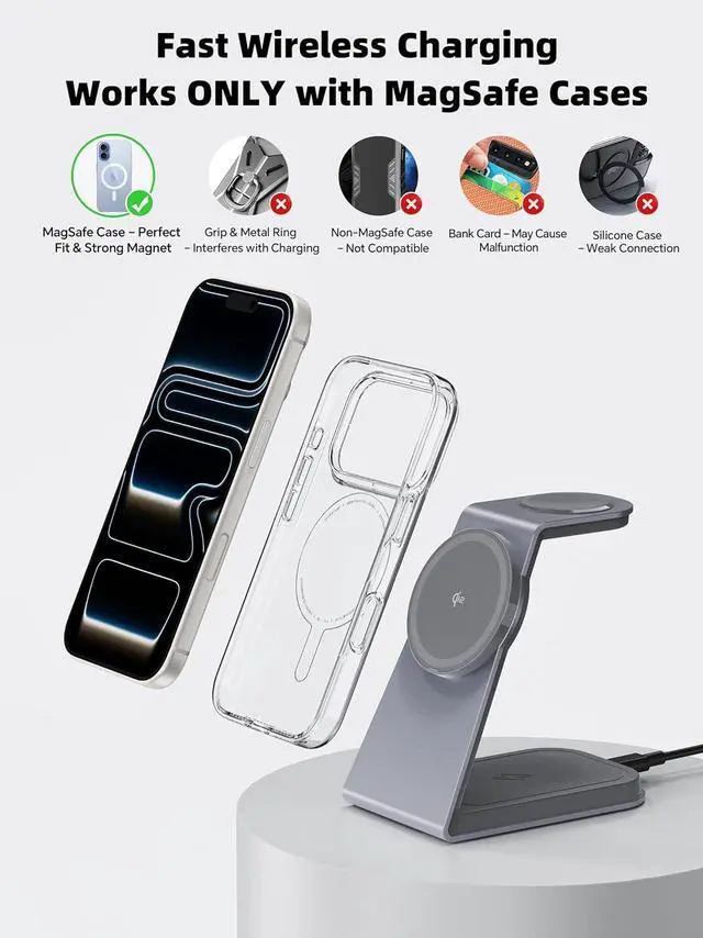 Compatible with MagSafe Cases OnlyThis wireless charger is compatible with MagSafe and magnetic phone cases (5mm thick). Non-slip silicone pads keep your setup steady and organized. Charge three devices at once with a single cable. ( Not compatible with Samsung Watches or AirPods Charging Case models A1523/A1722/A1602/A2032/A2031/A2565/A2564/A3053/A3050/A3054. )