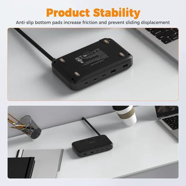 [Universal Compatibility and Stability] - This multi usb charging station with 5 feet extension cable measures 6.42 * 4.06 * 1.26 inches and weighs 25.93 ounces. It is compatible with iPhone 17/16, MacBook Pro/Air, Dell XPS, Samsung Galaxy S24/S23, Steam Deck, AirPods, etc. Four anti-slip rubber pads on the bottom increase friction and prevent sliding and displacement.