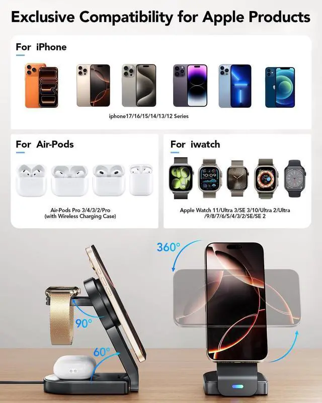 Wide CompatibilityThe foldable charger 3 in 1 for apple compatible with iPhone 17/17 Air/17 Pro/17 Pro Max/16/16 Plus/16 Pro/16 Pro Max/15/15 Plus/15 Pro/15 Pro Max/14/14 Plus/14Pro/14 Pro Max/13/13 Mini/13 Pro/13 Pro Max/12 Pro Max/12 Pro/12/12 Mini and Apple Watch Series 11/Ultra 3/SE 3/10/Ultra 2/Ultra/9/8/7/6/5/4/3/2/SE/SE 2, Air-Pods Pro 3/4/3/2 Mag-Safe Version, Air-Pods Pro.