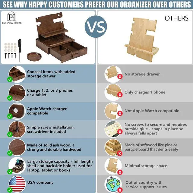 WE LISTENED: You wanted a wooden phone stand that could safely hold multiple phones; So, we designed our men' s docking station to fit up to 3 phones in front, complete with convenient slots for USB cables; Plus, we added 4 silicone pads to protect your tabletop