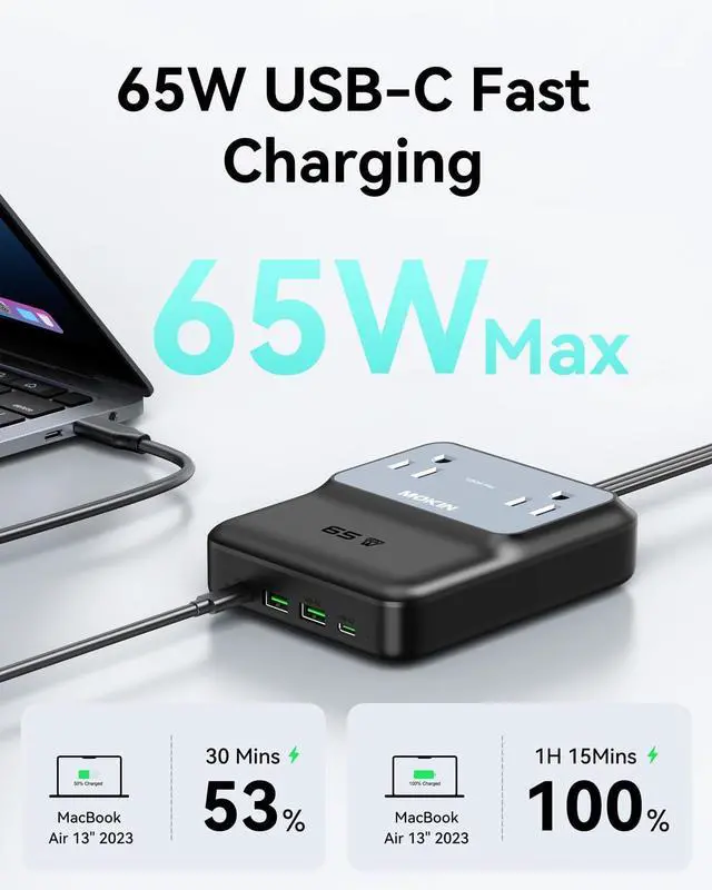 65W PD Fast Charging: The 65W max output available on USB-C1 port to rapidly charge your high-demand devices such as a 13-inch MacBook Air, efficiently reaching 53% in just 30 minutes