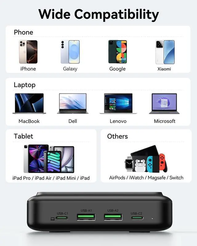 Widely Compatibility: This usb charging station compatible with All smartphones and tablets, such as iPhone 17/17 Pro/17 Pro Max/17 Air/16/16 Pro/16 Pro Max/16 Plus/15/15 Pro/15 Pro Max/15 Plus, iPhone 14/13/12/11/XS/XS Max/XR/X/10/8/8 Plus/7/7 Plus/6/6S/SE 2020, MacBook Pro/Air, iPad Air/Pro/Mini, Airpods, Samsung Galaxy S25/S24/S23/S22/S21/S20/S10/S9/S8/S7/S6/A12/A13/A22/A32/A52/A53/A71/Note 20 10, LG, Google Pixel, Kindle Fire, Tablets, etc