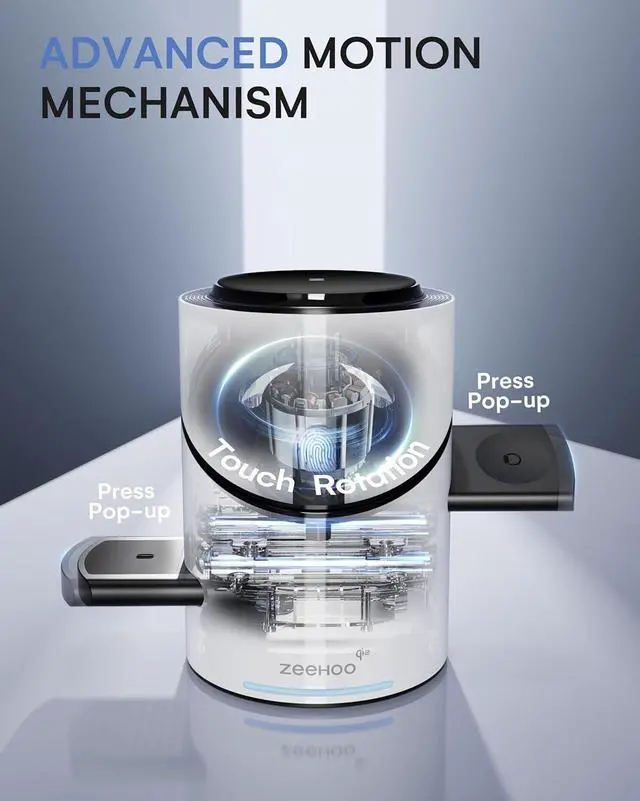 Smart Touch Control: Experience effortless operation with this iPhone charging station featuring instant touch activation, The rotating phone charging area that doubles as a phone stand, allowing for easy viewing while charging. The charging docks for your AirPods and Apple Watch pop up with a press, saving space and keeping your setup organized when not in use.
