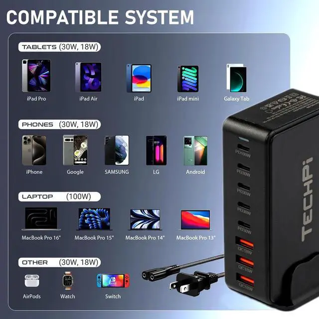 Widely Used our 8-port desktop charger supports PD 3.0 / QC charging protocols, compatible with iPhone series, Android phones, iPads, MacBook Air, AirPods, Laptops, and more. When opting for a GaN USB-C charger, verify wattage and power delivery capabilities for device compatibility.