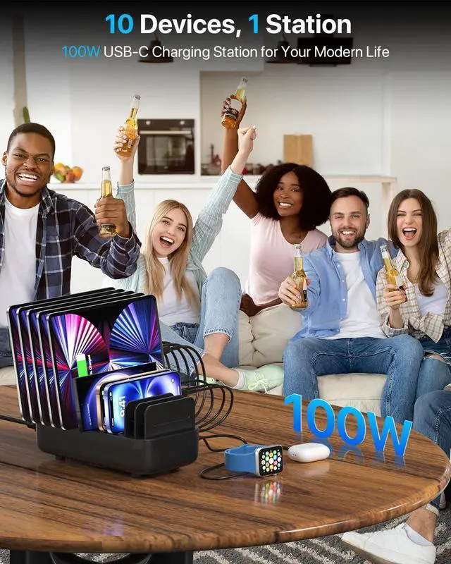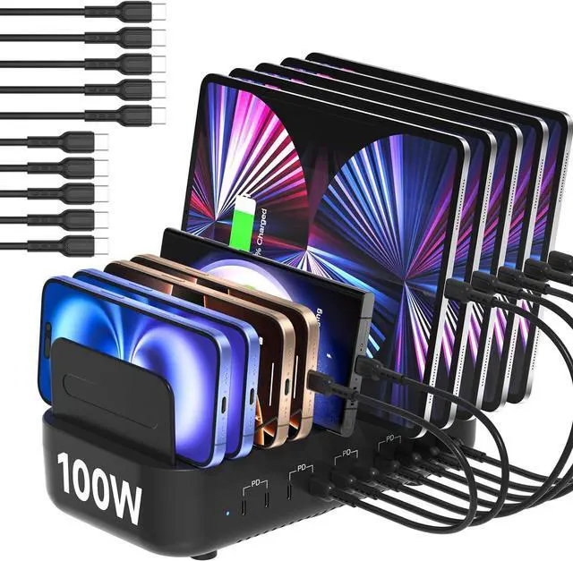 10-Port Charging Station Organizer Unlike charging stations with only USB-A ports, our multi-device charging station features 10 USB-C ports, delivering a total output of up to 100W. It can efficiently store and charge up to 10 devices simultaneously. This multi charger station helps eliminate messy cables and multiple wall chargers, keeping your desk neat and organized. The device comes with 10 USB-C to USB-C cables, so you don' t need to purchase additional cables.