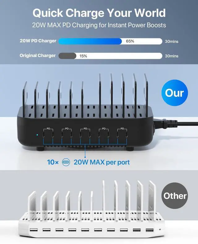 Powerful 20W PD Fast Charging This multi charging station features 10 USB-C ports, each delivering up to 20W. It supports multiple output options, including 5V/3A, 9V/ 2.22A, and 12V/ 1.67A, allowing your devices to charge up to three times faster than a standard charger. The smart charger organizer automatically detects connected devices, optimizing current output to minimize charging time. Upgrade your charging experience with unmatched speed and convenience.