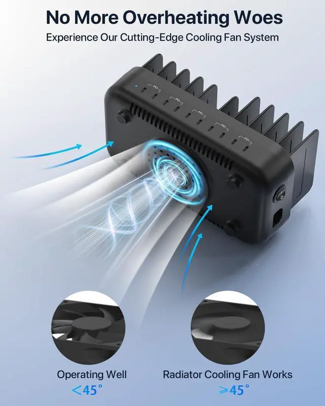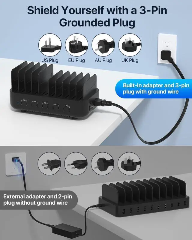 Multi-Protection safety The charger station has obtained a series of certification, guaranteeing superior safety for your devices. Featuring a robust multi-protection system, it shields against overcharging, over-voltage, and short circuits. Crafted from fireproof PC material and utilizing cutting-edge internal cooling technology, it effectively prevents overheating. The 3-pin power plug enhances safety by preventing electric leakage and shock, making a safer choice than standard 2-pin plugs. You can use it with complete peace of mind!