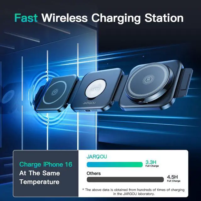 [Fast Charging with Advanced Temperature Control] Tired of slow charging and overheating devices? Our Wireless charging station features a smart temperature control chip 3.0 that prevents overheating while delivering optimal charging speeds: 7.5W for iPhone, 3W for AirPods, and 2.5W for Apple Watch. In our laboratory tests, JARGO can fully charge iPhone17 in just 3.2 hours without dangerous overheating, while other brands required cooling periods. This fast wireless charging station protects your valuable devices with triple protection against over-voltage, over-current, and over-temperature issues.