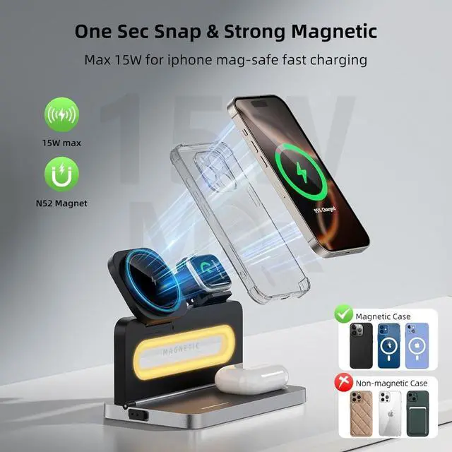 Magnetic Wireless Charging Station: Egognaw 3 in 1 wireless charger for MagSafe Charging Station makes fast charging safe and easy. The built-in super strong magnet makes alignment instantly and precisely, just 1 second to achieve lightning fast wireless charging, bringing you a fast and stable wireless charging experience. The magnetic wireless charger stand support three devices to charge simultaneously. Put your phone onto the device horizontally or vertically to get it charged instantly
