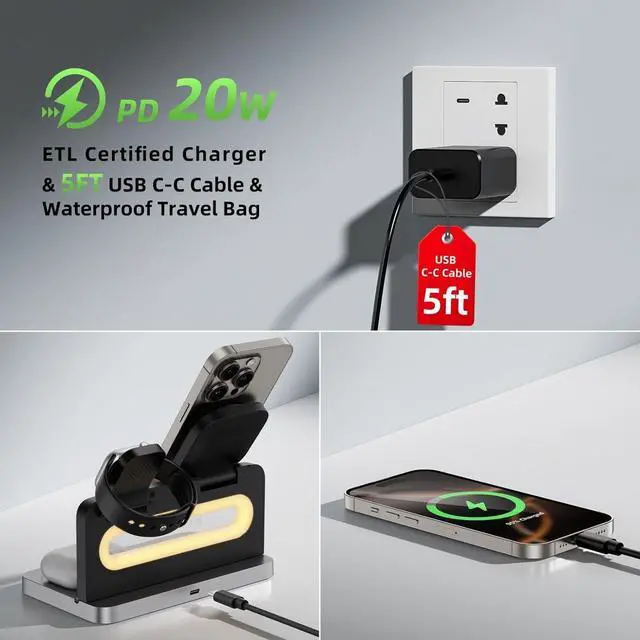 package includes: 3-in-1 Magnetic Wireless Charging Station, PD 20W USB-C Adapter, USB C-C Cable( 1.5 m/5ft), User Manual. If you have any problems during use, please feel free to contact us even beyond the return window