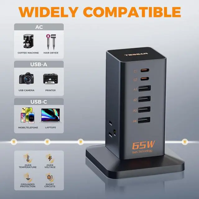 GaN Ttechnology: TESSAN charging station for multiple devices built-in GaN chip, charging 4 times faster than ordinary plug, featuring dynamic temperature sensors allows your mobile phone to charge for 10 hours without getting hot, reducing your devices loss