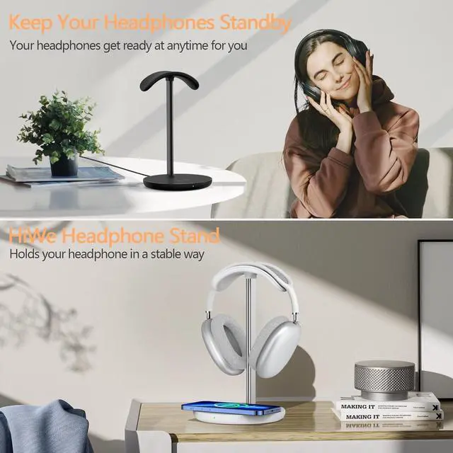 SAVE SPACE & NO MESSYFoldable headset holder helps declutter the workspace. Assemble 2-in-1 headphone stand & wireless charger quickly with tools included. Headphone holder store headphones or headsets while only taking up a small space. Say goodbye to tangled wires and messing cables, just place phones headsets on fast charger station, charge them without the cable. Headphone holder with wireless charger is perfect for holding headsets on desk or table at home, office and recording studio.